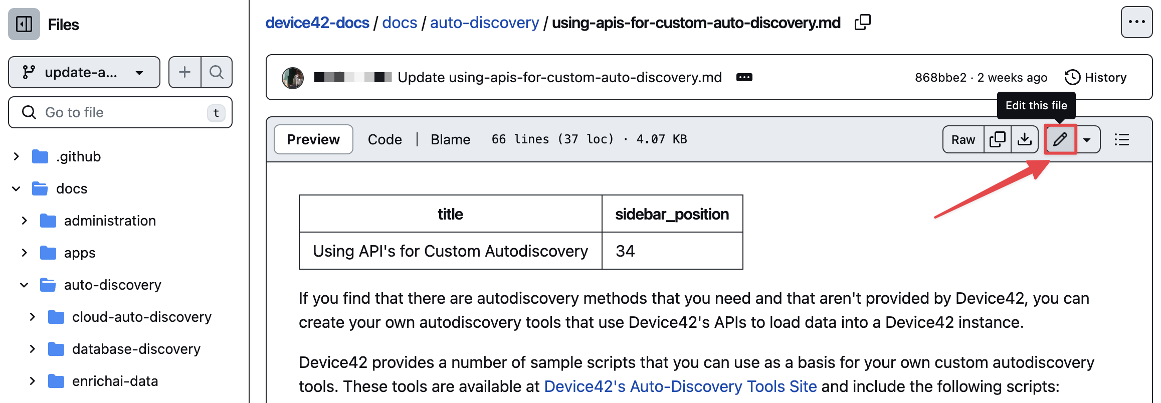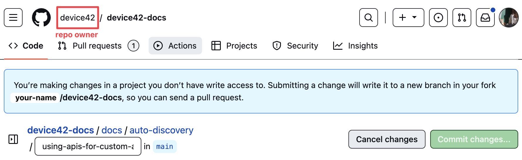 Click on the "Edit this page" link at the bottom of the document you want to edit and you'll be directed to the Device42 repository. On the top-left corner, you'll see device42 / device42-docs, meaning that device42 is the owner of the repository called device42-docs. When we navigate to our forked copy, it will display your-github-account-name / device42-docs.