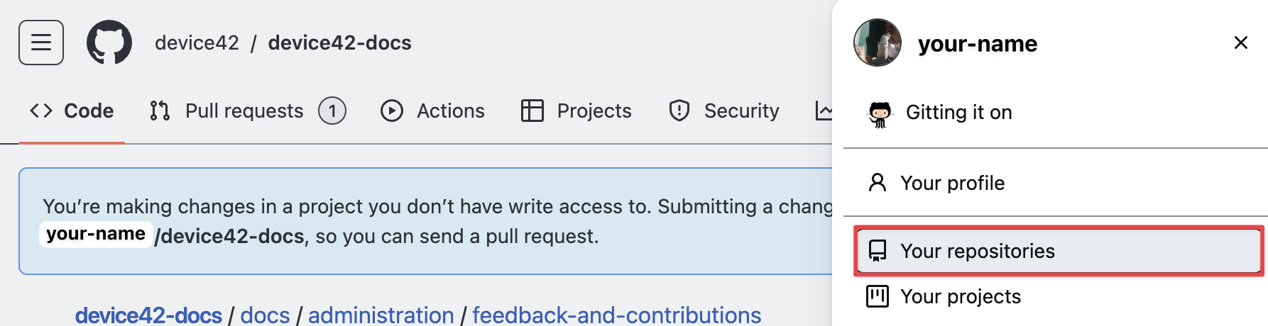 You should now see your-github-account-name / device42-docs in the top-left corner.