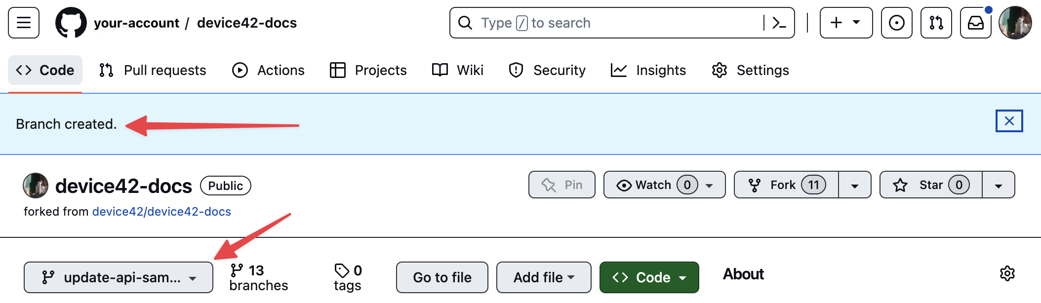 You'll see the "Branch created." message when the page reloads. The dropdown menu will display the name of the new branch instead of the original "main" branch.