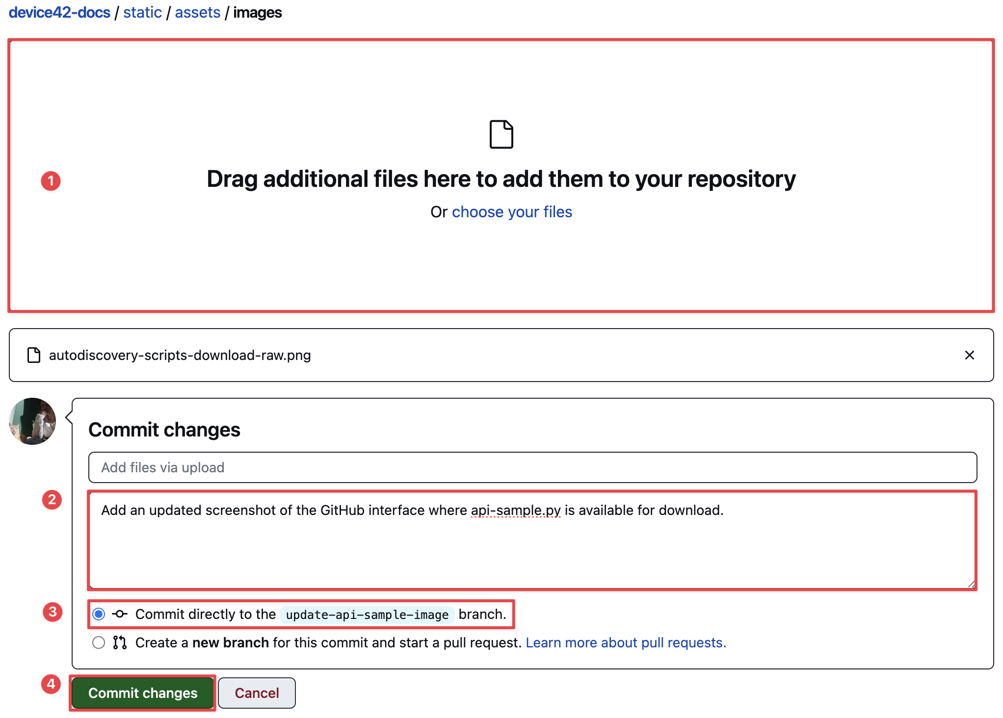 Add the image by either dragging the file to the box or selecting it from your file explorer (1). Save this change by committing it. Next, write a short explanation of the change you made (2) and keep the "Commit directly to the update-api-sample-image branch" option selected (3).