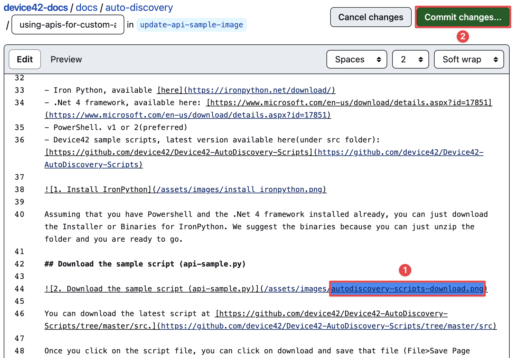 In this example, we change the old image name of wpid2787-2._Download_the_sample_script__api-sample.py_.png to autodiscovery-scripts-download.png (1). The /assets/images/ location preceding the image name will remain the same because the location of the image hasn't changed.