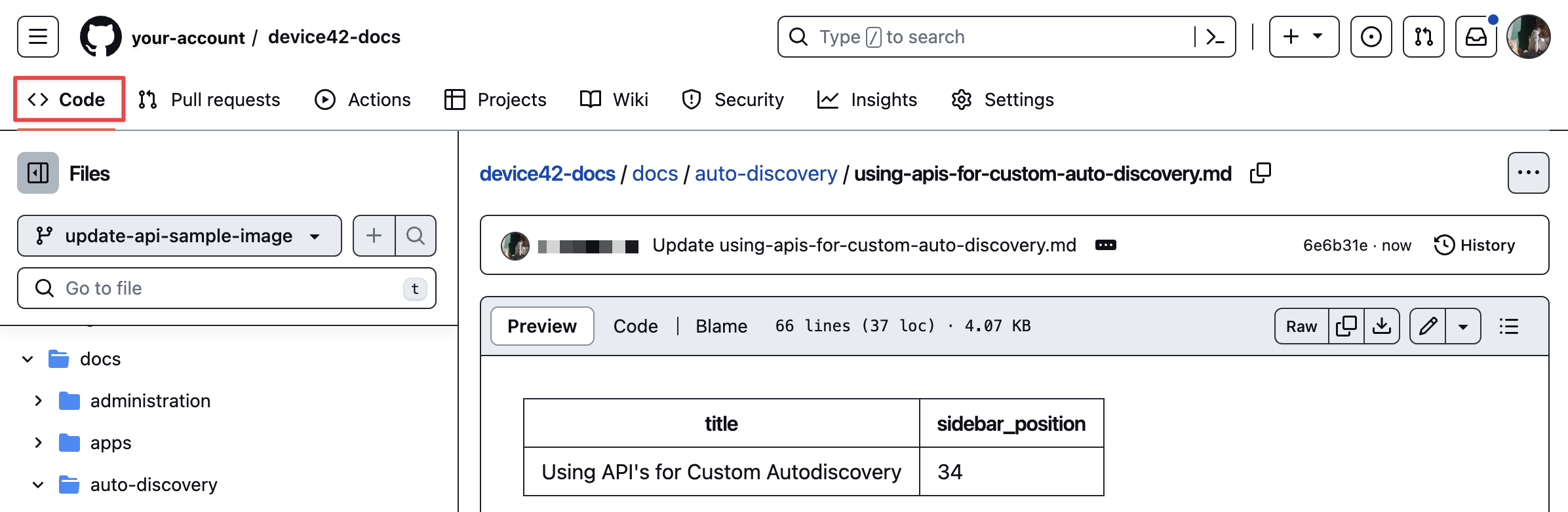 Find the Markdown file corresponding to the page you want to add the image to. In this example, the article is titled "Using APIs for Custom Autodiscovery", and the Markdown file is named using-apis-for-custom-auto-discovery.md.