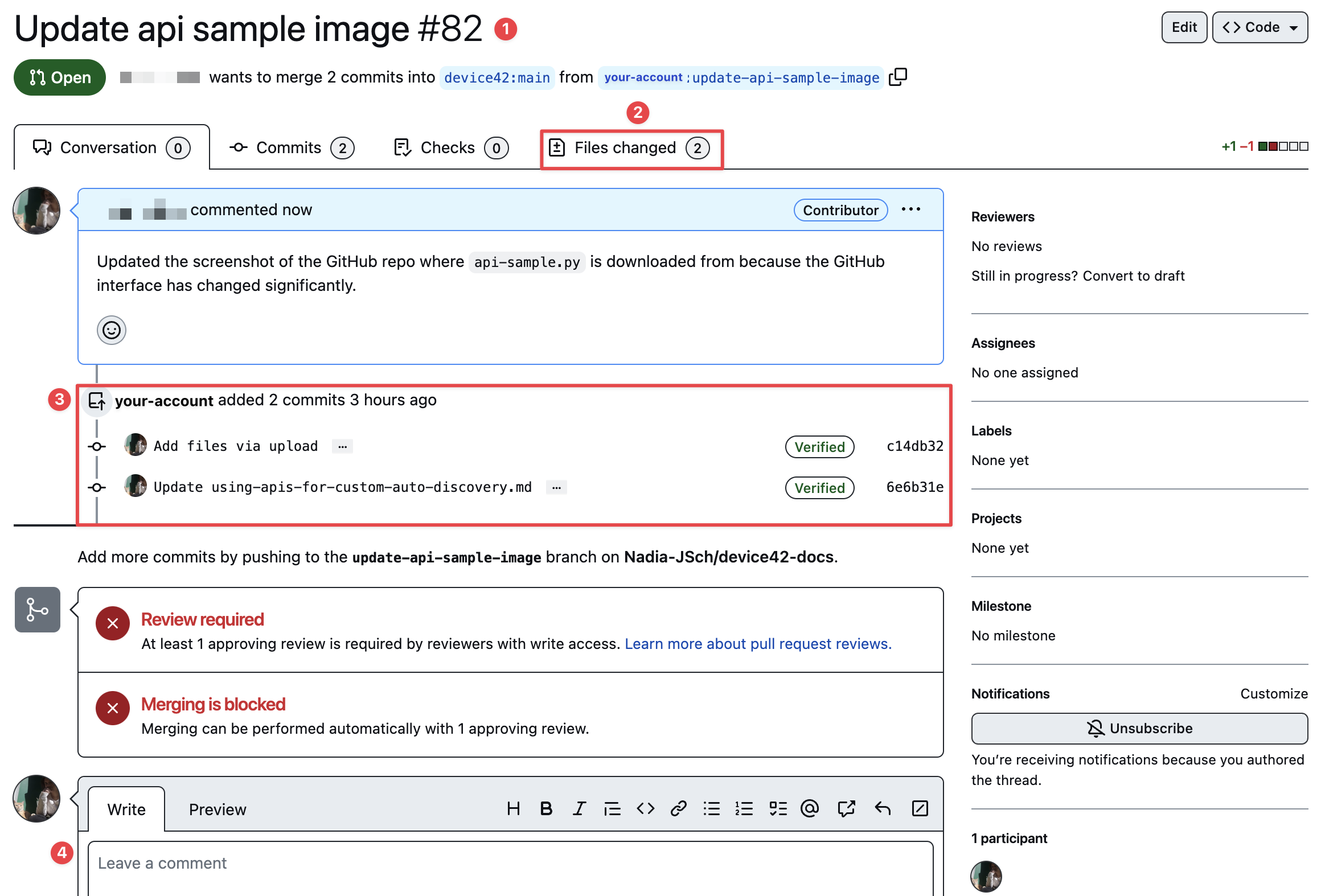 When your pull request has been submitted, you'll be directed to a page with the name and number of your pull request listed at the top (1). You can view the changes you've made by clicking on the "Files changed" tab (2). You'll see the commits you made listed on a timeline (3). Below that, you'll see crosses with "Review required" and "Merging is blocked" messages next to them. In the text box below, you can add additional comments about the pull request if needed.