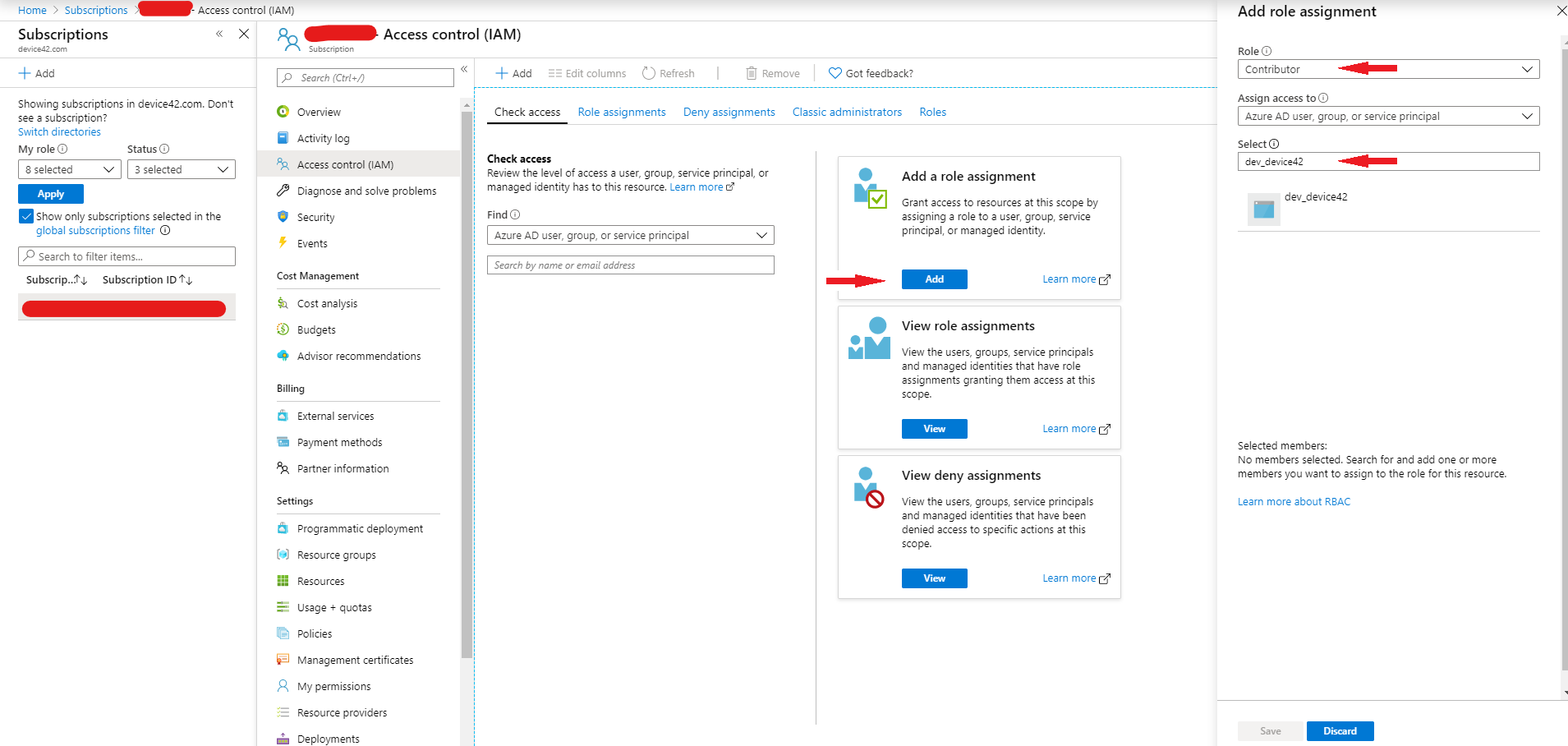 5. Select a "Contributor" role and type the name of the app registration in the "Select" text box (in this case, the name of our app was dev_device42).