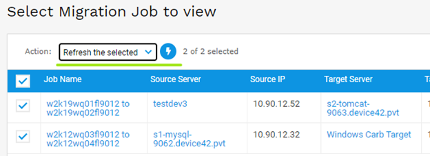 - After selecting the action, go back to the Migrate Jobs list page and the status of the job should be updated. If there’s a delay between your D42 machine and your target server, click the Refresh Status link to refresh the job status.