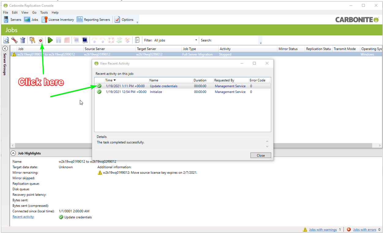 - You can also verify that the credentials update operation has successfully completed by examining the job in the Carbonite Replication console’s Jobs tab and clicking the View Recent Activity button in the job control row.
