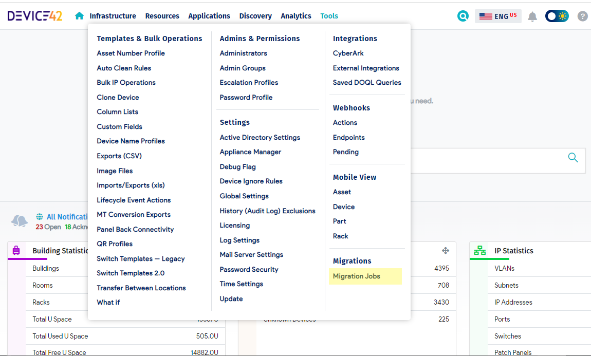 - From D42’s main page, click on the top menu bar’s Tools link and select Migrations > Migration Jobs.