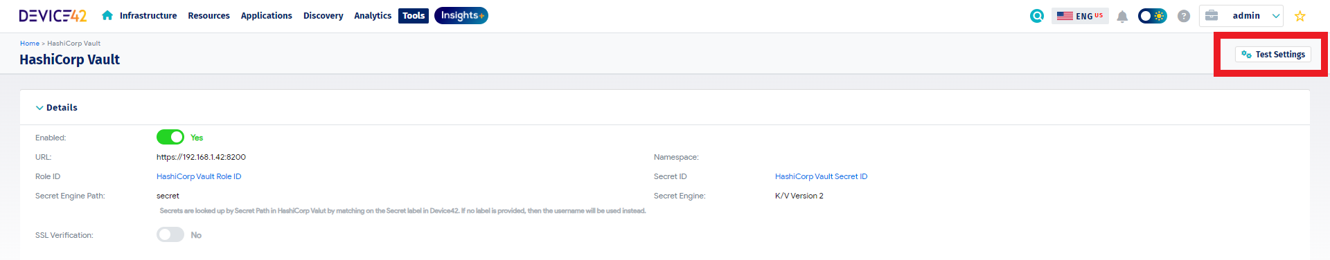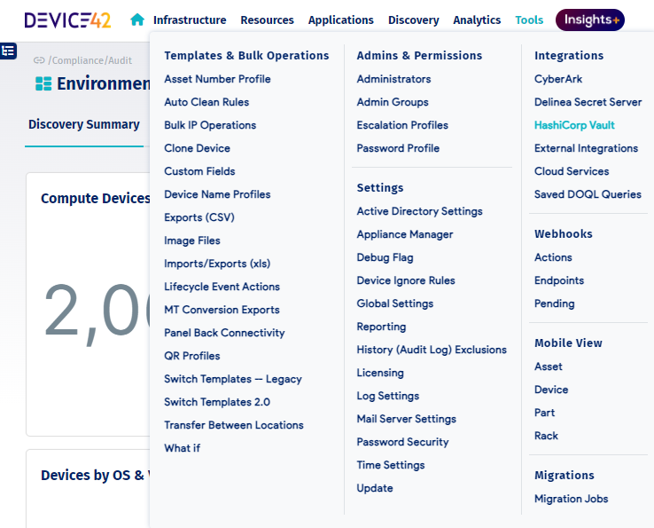 - Select Tools > Integrations > HashiCorp Vault from the Device42 menu.