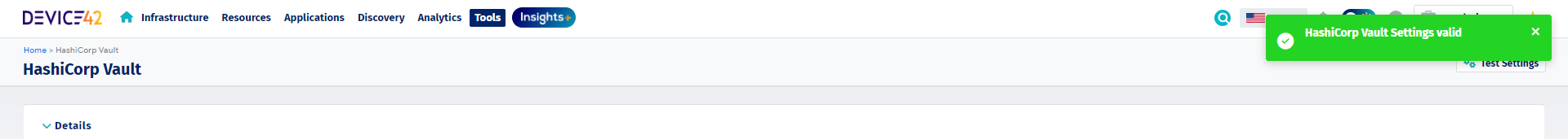 - The Test Settings button attempts to validate the supplied configuration settings by retrieving a token from HashiCorp Vault. If a token is successfully retrieved, a message stating "HashiCorp Vault Settings Valid" should appear in the top right corner. (Example Success Response Below)