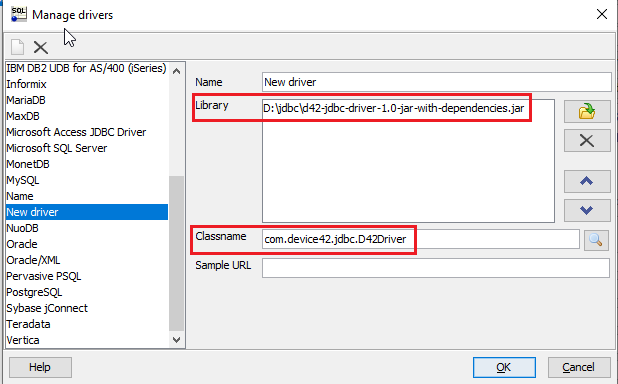 - Create new driver using the path to the downloaded JDBC driver JAR file and the classname com.device42.jdbc.D42Driver.